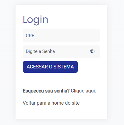 1) FAÇA O LOGIN: DIGITE CPF E SENHA DE CADASTRO. CASO TENHA ESQUECIDO A SENHA É SIMPLES, CLIQUE NO BOTÃO ABAIXO DE "ESQUECEU SUA SENHA" QUE RECEBERÁ A SENHA POR E-MAIL
