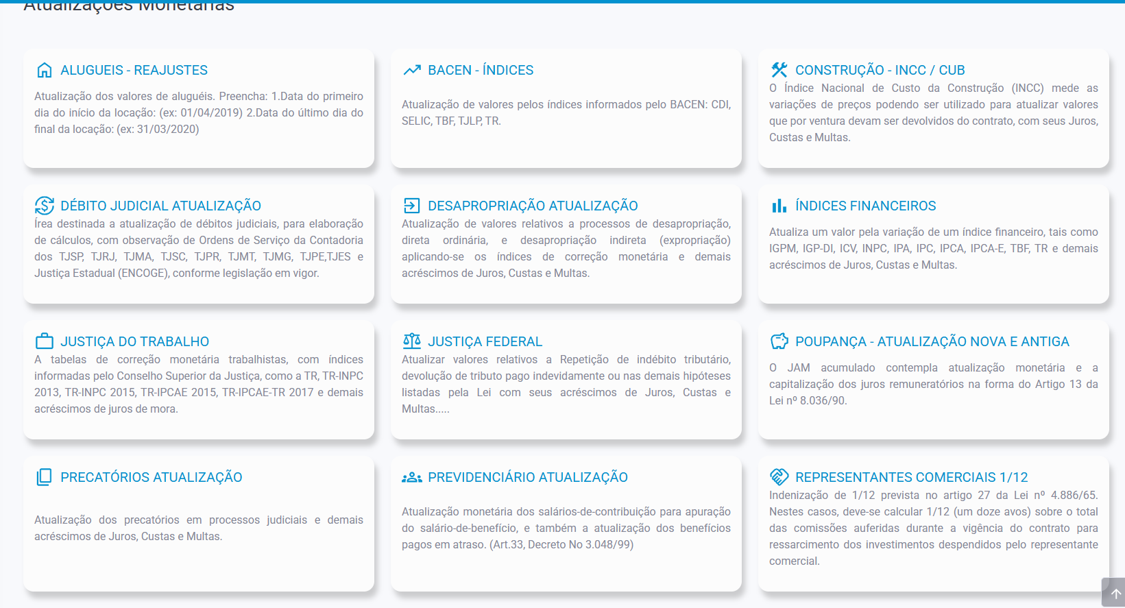 2) APÓS O LOGIN O USUÁRIO SERÁ DIRECIONADO A UMA PÁGINA COM VÁRIOS TIPOS DE CÁLCULOS DE ATUALIZAÇÃO, QUE PODERÁ SER OBSERVADO NA FIGURA ABAIXO. ENTÃO BASTA O USUÁRIO ESCOLHER QUAL MA´TÉRIA PROVEM SUA ATUALIZAÇÃO E CLICAR NELA QUE ABRIRÁ A PLANILHA DE ATUALIZAÇÃO.