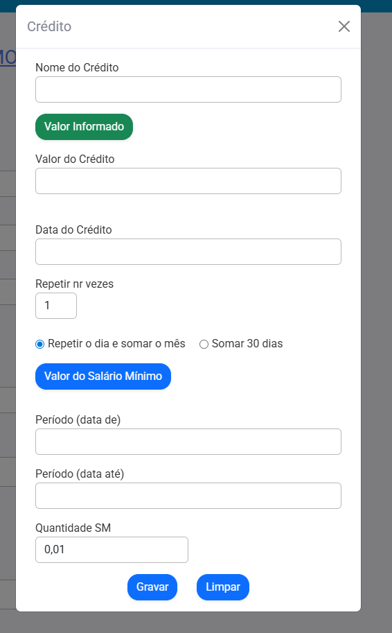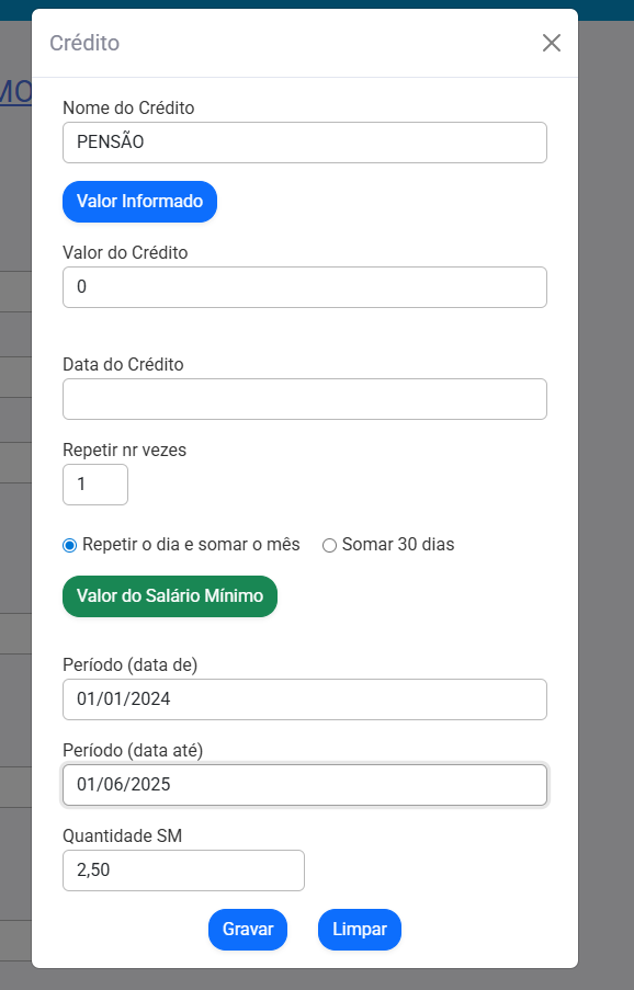 15) DOS CRÉDITOS: NO EXEMPLO ABAIXO COLOCAREMOS OS CRÉDITOS. TEMOS DUAS FORMAS DE APURAR 1o: VALOR INFORMADO, E ESTE TEMOS A POSSIBILIDADE DE REPETÍ-LO NA QUANTIDADE QUE QUEREMOS "REPETIR" , E O 2o. NA QUANTIDAD DE SALÁRIOS MÍNIMOS.