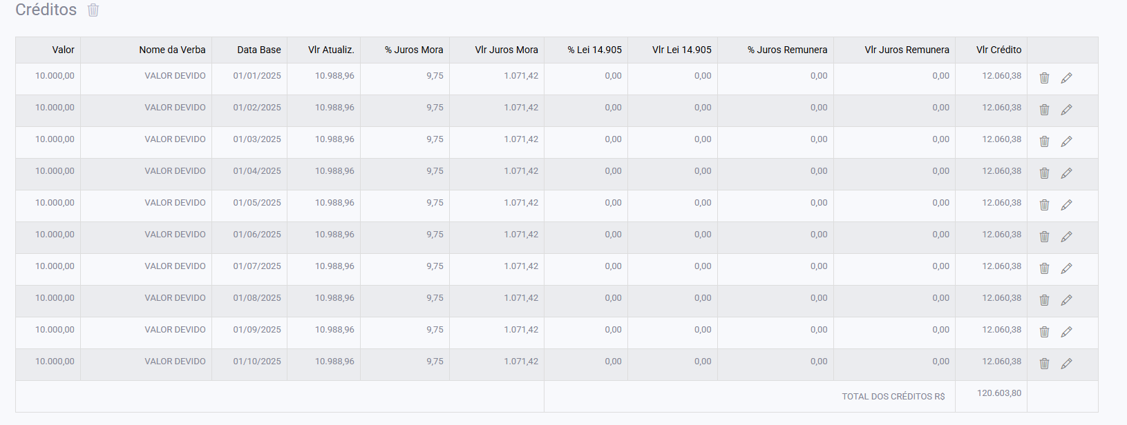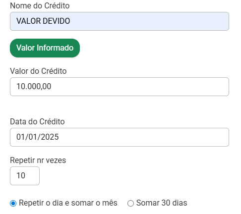 16) NO EXEMPLO INFORMAMOS O NOME DO CRÉDITO E SEU VALOR (R$ 10.000,00) A PARTIR DE 01/01/2025 E REPETIDO 10 VEZES.