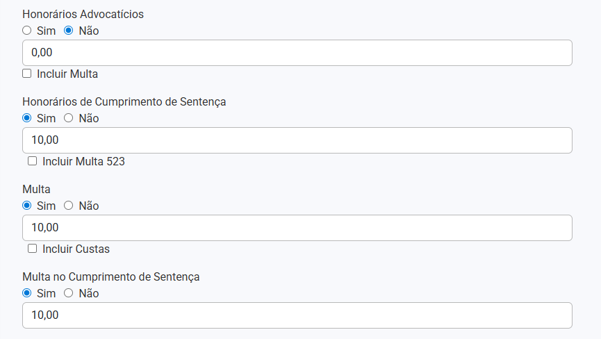 11) APÓS ESCOLHER OS CRITÉRIOS DE CORREÇÃO MONETÁRIA E JUROS DE MORA, FINALIZAMOS O CADASTRO DOS DEMAIS INTES: HONORÁRIOS E MULTAS.