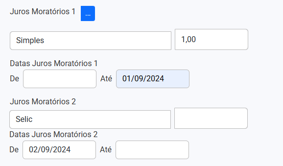 9) NO EXEMPLO SELECIONAMOS JUROS SIMPLES ATÉ DIA 01/0/2024 E APÓS JUROS SELIC. VEJA QUE A DATA INICIAL, COMO NÃO ESPECIFICADO INICIA A CONTAGEM DA DATA DO CRÉDITO, INDO ATÉ 01/09/2024. JÁ NO 2o. TEMOS QUE COLOCAR A DATA SEGUINTE E CASO NÃO PREENCHER A DATA FINAL ESTE SERÁ CALCULADO ATÉ A DATA DE ATUALIZAÇÃO DO CÁLCULO.
