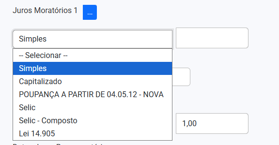 7) CA´LCULO DOS JUROS DE MORA: NO EXEMPLO SELECIONAMOS JUROS SIMPLES. TEMOS AO TOTDO SEIS (6) OPÇÕES DE JUROS COMO BEM PODEMOS OBSERVAR ABAIXO.