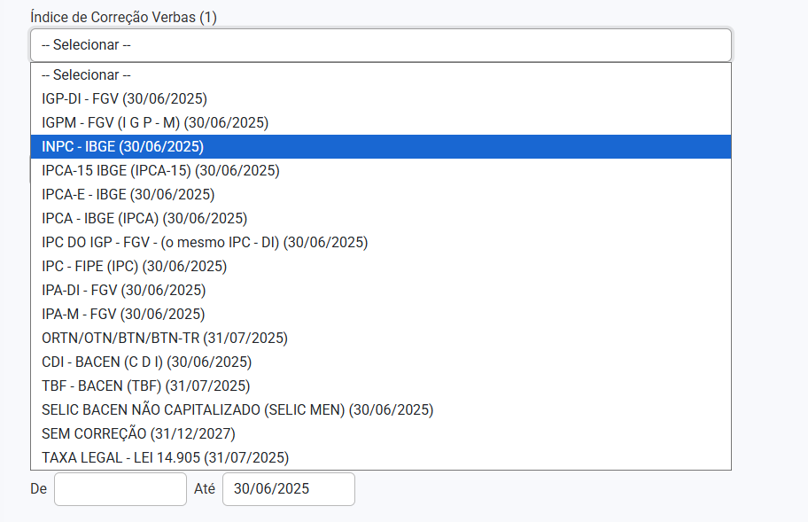 5) NO EXEMPLO SELECIONAMOS ATUALIZAÇÃO PELO INPC - IBGE (A DATA SE REFERE ATÉ QUANDO ESTE ÍNDICE ESTÁ ATUALIZADO.